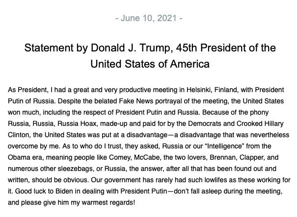 June 11, 20214 yr "Great and productive meeting?" More like he got on his knees on used his chin as Putin's personal nut coaster on the world stage for the entire world to see...........