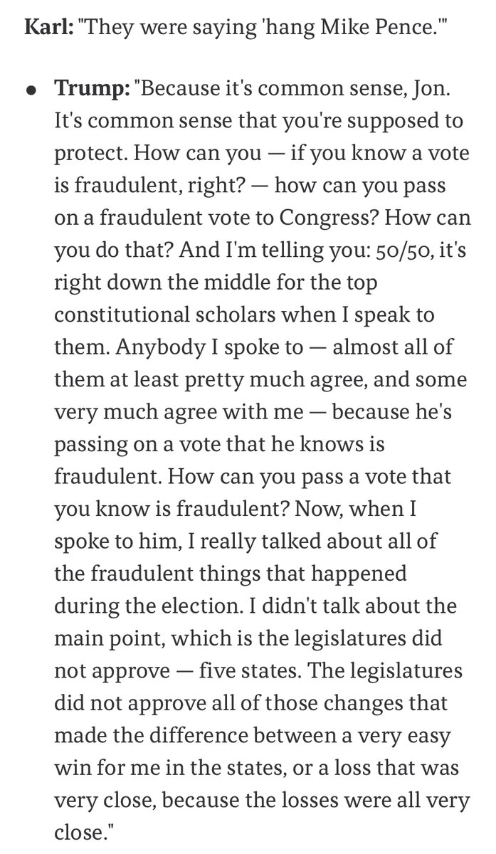 November 15, 20213 yr Author Quote With then-Vice President Mike Pence set to take the reigns in certifying the Electoral College results affirming now-President Joe Biden's victory, Trump had been pressuring his No. 2 to overturn the election. The New York Times reported in January that Trump went so far as to call Pence on January 6 as the then-vice president was leaving his residence to oversee the vote certification. "You can either go down in history as a patriot," Trump reportedly said, according to two people familiar with conversation, "or you can go down in history as a ****." When ABC News Chief Washington Correspondent Jonathan Karl in a March 18 interview had asked Trump if the report was accurate, the former president didn't dismiss the comments. "I wouldn't dispute it," he told Karl. Karl responded: "Really?" The former president repeated his statement: "I wouldn't dispute it." 🤡🌎
