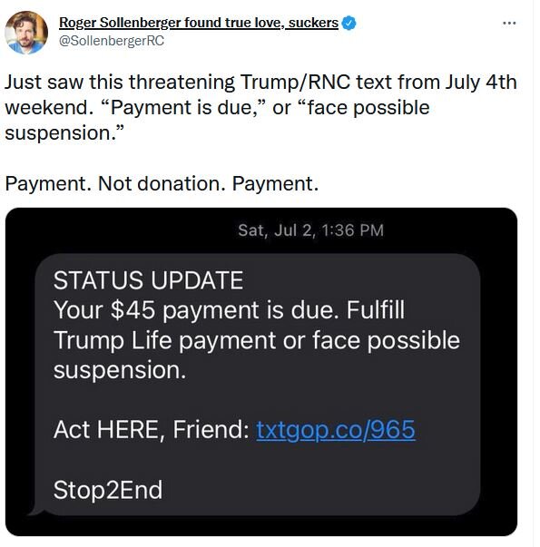 July 13, 20223 yr Author ooh...there's a pledge! Quote Do you support Free Speech, Trumpbot? Big Tech is continuing its unconstitutional CENSORSHIP of President Trump and conservative voices, which is why we need our Best Patriots to take the pledge and join Truth Social. TAKE THE PLEDGE >> The right to Free Speech is paramount, and we need to know which Patriots we can count on to defend this essential American freedom. Take the Official Pledge to join Truth Social in the NEXT HOUR and show your support for President Trump and his fight against censorship. >> TRUTH SOCIAL PLEDGE SUPPORTER: Trumpbot of Team Trump MEMBER ID: 14127596 - 2022 SIGNATURE: MISSING DEADLINE: ONE HOUR ADD YOUR NAME NOW >> Note: If you've saved your payment information, your donation will go through immediately. CONTRIBUTE $20 CONTRIBUTE $15 CONTRIBUTE $10 CONTRIBUTE $5 CONTRIBUTE ANY AMOUNT By taking the pledge to join Truth Social, you’ll be joining millions of your fellow Patriots who are voicing their opinions on Truth Social free from political bias. Time is RUNNING OUT to take the pledge and prove to President Trump that you have his back in the fight against Big Tech suppression. Please take the Official Pledge to join Truth Social RIGHT NOW and commit to protecting Free Speech. Thank you, RNC HQ