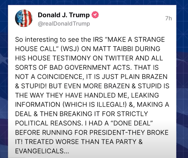March 30, 20232 yr 13 hours ago, jsdarkstar said: So every one pays more in taxes than Donald Trump has. Yet goes Bat S crazy when the IRS investigate Matt Taibbi. Trump was never audited. That needs to happen to him and the Other Billionaires who don't pay any taxes. Let's not forget he used the IRS to audit his political enemies. It's tiring and the crazy stuff he spews every day. And people want this nut as President. "treated worse than tea party and evangelicals" So...what is he saying here? That the same tea party and evangelicals that were a big part of his base are in fact bad? That should help his reelection chances.