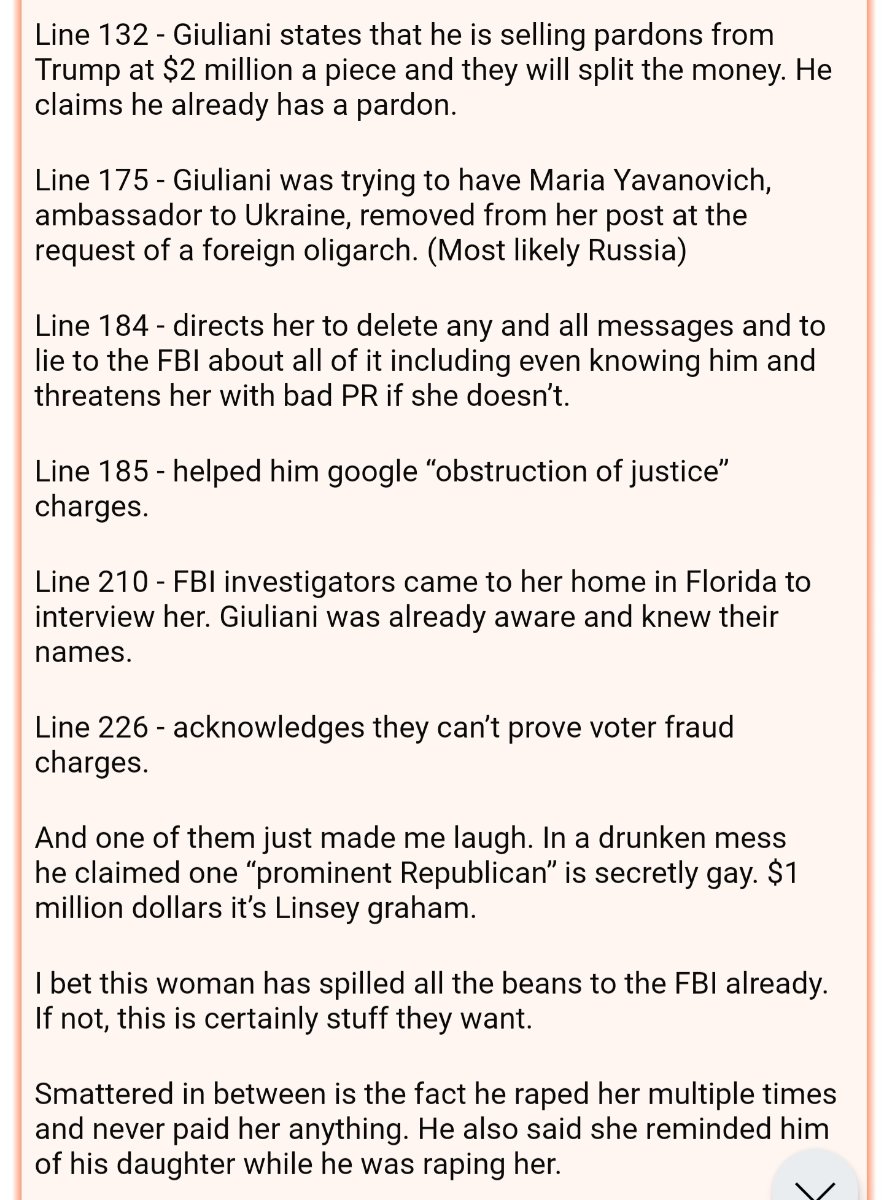 May 16, 20232 yr Rudy selling pardon's for $2 million dollars to split with Trump. Felony. Rudy also received a $1 million payment, that he didn't declare to the IRS. Felony.