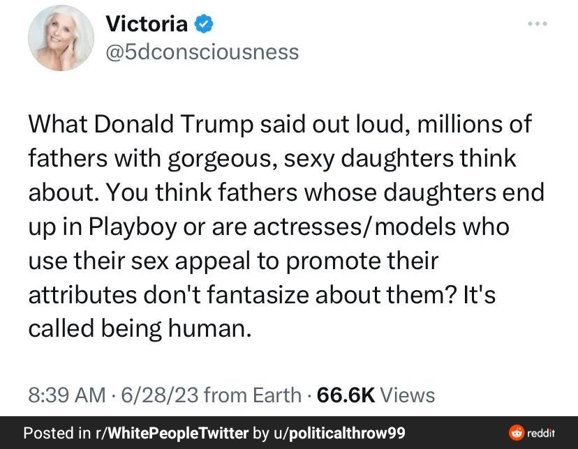 June 28, 20232 yr 8 minutes ago, Tweek said: It's not. Here response when a follower asked about it yeah people have all kinds of intrusive thoughts all the time. that's pretty normal. what's not normal is both having an intrusive thought that ought to immediate disgust you, such as for example sexualizing your freaking daughter, and then deciding it's something you should share with a bunch of other guys. then play off like it's normal. like holy crap.