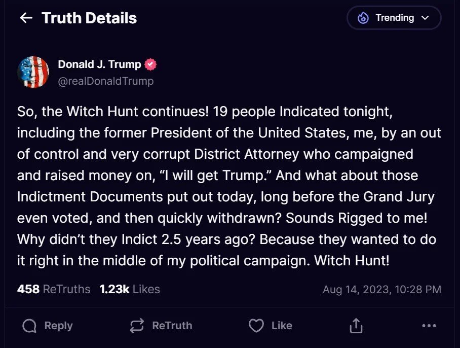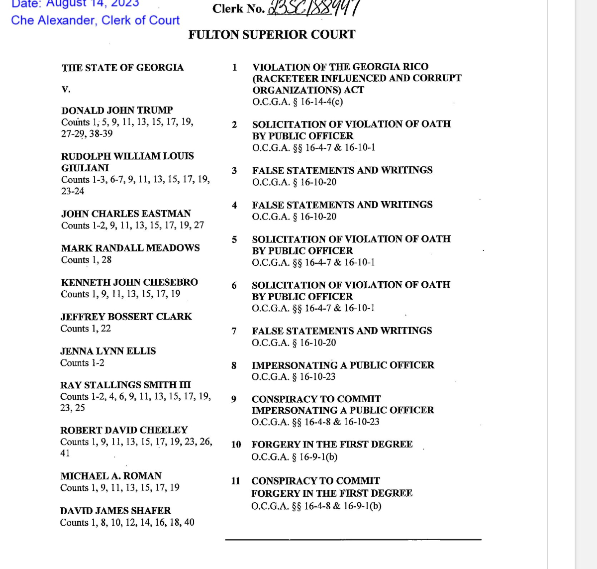 August 15, 20232 yr She can't try all 19 at the same time. It would turn into a total and complete circus. The better strategy is to have 3 trials of 6 -7 Defendant. Easier, more managable. First Trial. Trump, Rudi, Meadows, Eastman, Clark, and Powell. 2nd Trial: Cheeseboro, Clark, Ellis, Cheely, Roman, Shafer, 3rd Trial: Stil, Lee, Flyod, Kuti, Latham, Hall, Hampton and Smith.