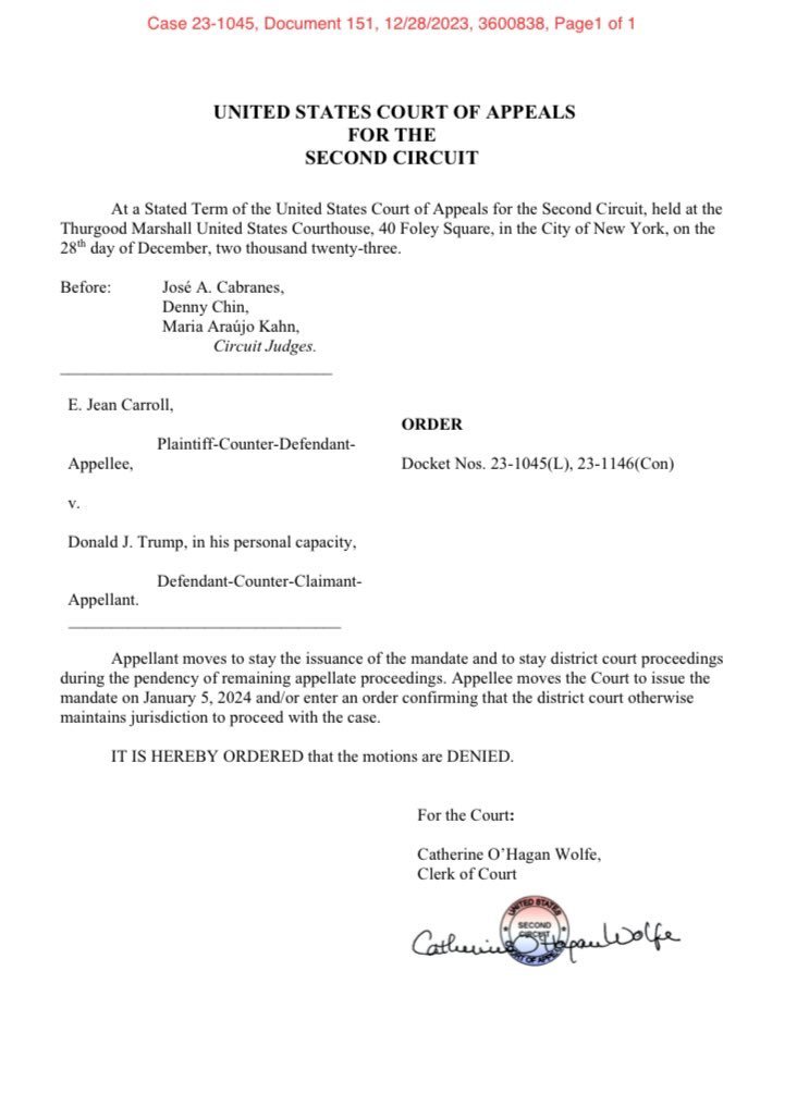 December 28, 20231 yr The 2nd Circuit appeals court has denied Trump’s motion to stay the ruling rejecting his claim of immunity from E. Jean Carroll’s lawsuit.