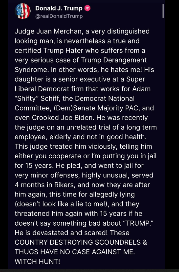 March 26, 20241 yr Welp there we have it. Trump has attacked the daughter of the Judge Merchan in a demented post of his. This is the Judge overseeing his criminal trial. Trump belongs in Jail.