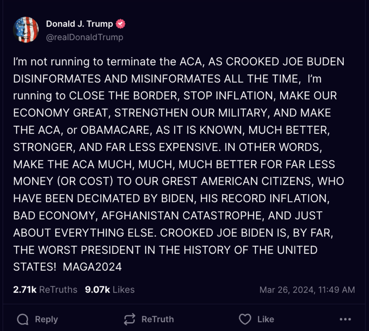 March 27, 20241 yr Disinformates. Misinformates. Says Dementia Don the worst President in U.S. History.