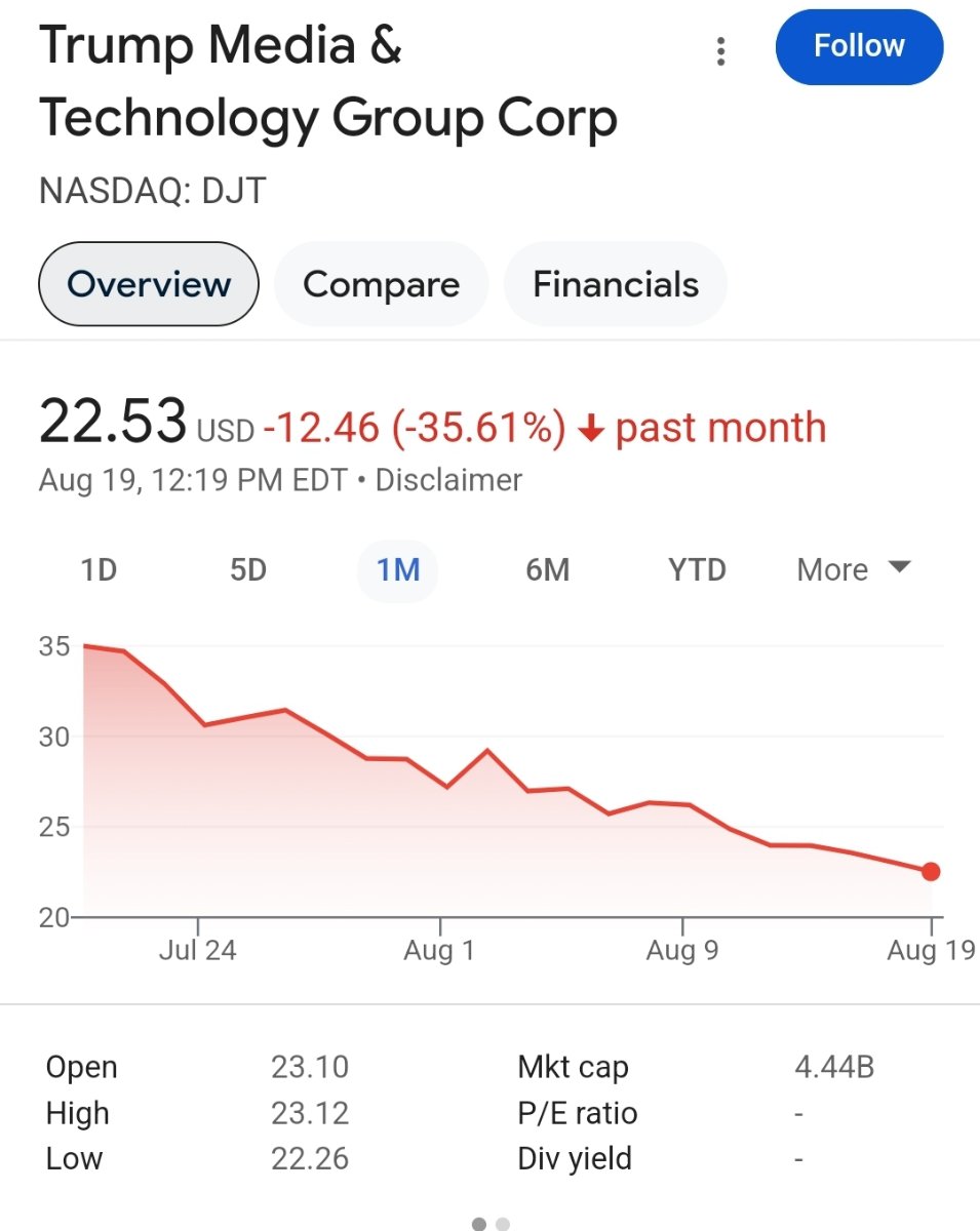 August 21, 20241 yr Truth Social parent company stock prices fall to new low after public trading debut https://www.usatoday.com/story/money/2024/08/19/truth-social-stock-price-low-trump-djt/74867017007/ Are you cucks sick of winning yet?