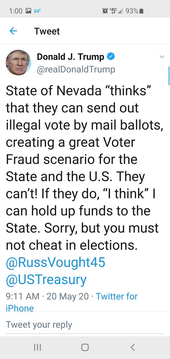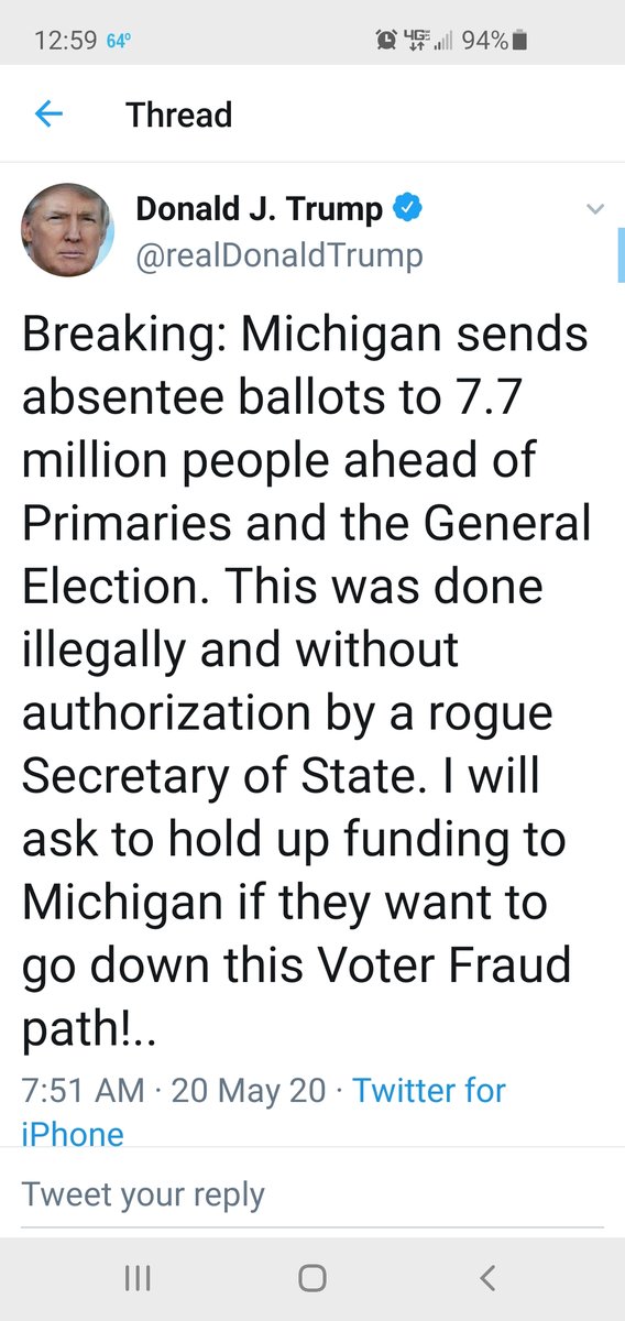 May 20, 20205 yr Author so, the person who voted by mail in florida is threatening to hold up funding to states that send out absentee ballots. totally normal...not unhinged at all...and definitely not voter suppression....nah.
