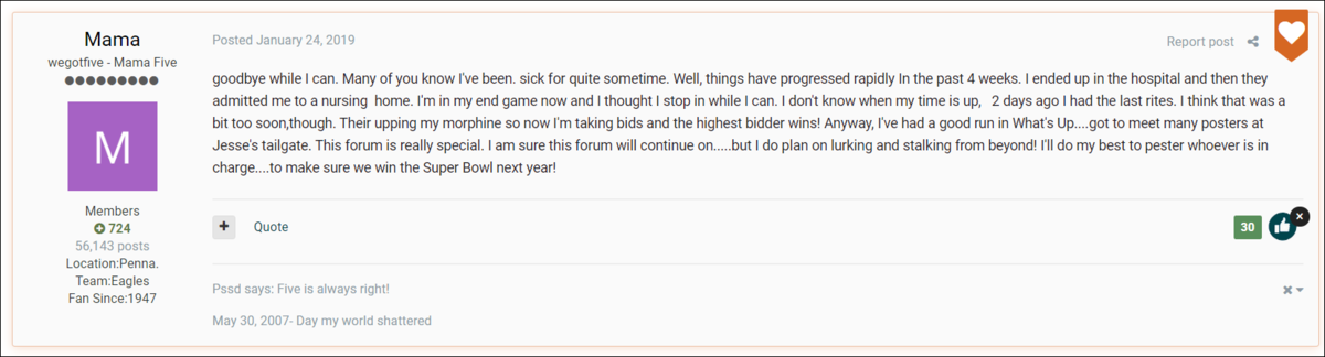 April 30, 20205 yr I created an account for @Mama (wegotfive) Put her photo too. VA is going to copy her profile details I archived. Her goodbye post and her real photo. Her name was Helen. She enjoyed the community here, the distractions through losing her husband suddenly and going through cancer. Photo was in a McNabb jersey at one of the EMB tailgates. She's forever lurking!