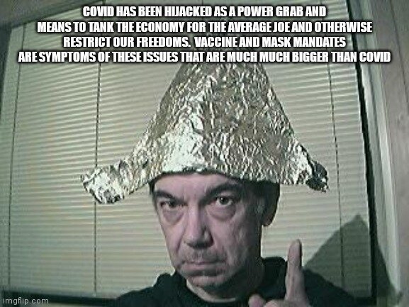 November 1, 20214 yr 35 minutes ago, Procus said: No - Procus is of the opinion that Covid has been hijacked as a power grab and means to tank the economy for the average Joe and otherwise restrict our freedoms. Vaccine and mask mandates are symptoms of these issues that are much much bigger than Covid.