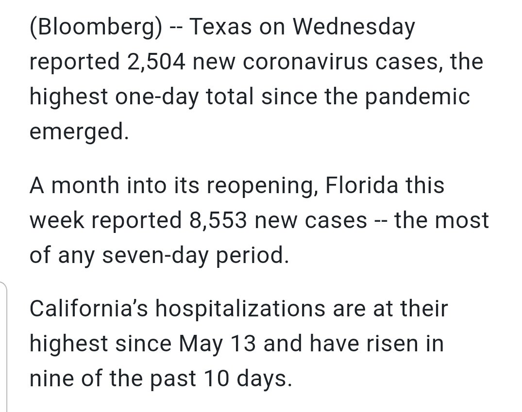 June 11, 20205 yr 12 hours ago, What The F said: And the hospital system my wife works for in south Florida has seen an increase of covid19 patients over the last week from 73 within the 4 hospitals on June 7th, to 122 today. That's a big jump and the highest total they have ever had. 1,700 new cases overnight in Florida, we’re on pace to break our own record
