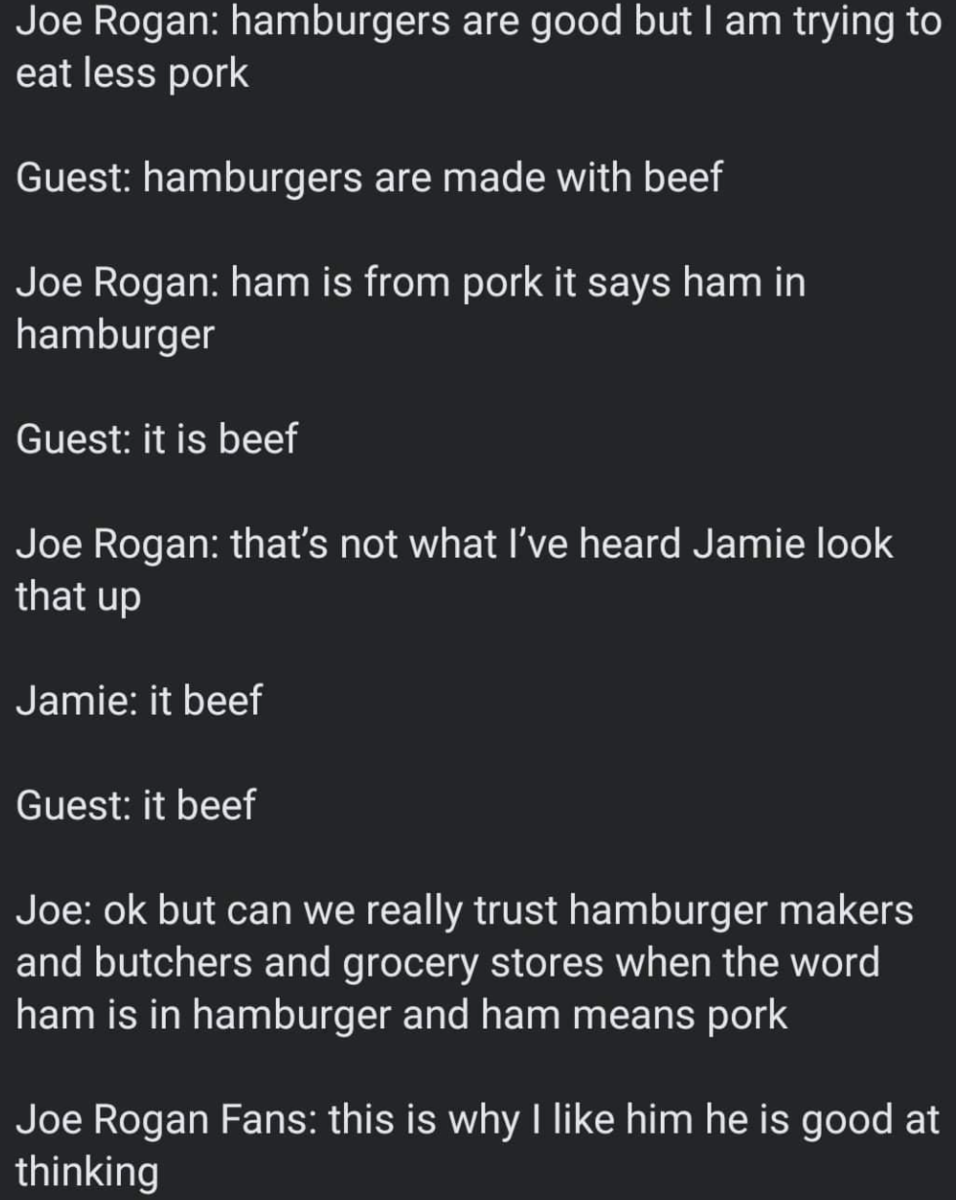 January 15, 20223 yr 3 minutes ago, mayanh8 said: It's definitely not. But seeing a ton of them pop up after his exchange with the doctor. That one was the best I've seen so far and accurately portrays all things Joe Rogan in the past couple days. The best was when Rogan says "when we read these things, it’s like where are we getting this from?” And immediately wants to attack the source, not the info. Feel like I’ve heard that somewhere before. 😆