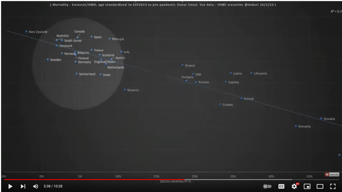 July 22, 20232 yr ...and now from the same video, some more info about "excess deaths" that we all agreed would be a gold standard metric over the course of the pandemic the x-axis is excess deaths by % and the y-axis is rate of vaccination