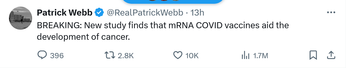 June 18, 20241 yr 1 hour ago, Procus said: Why do you always share stupid crap? This Patrick Webb idiot is a nutter, and the "study" he shares is a paper that cites as its only "evidence" a study done on mice who were injected with melanoma then with multiple mRNA vaccines variants to determine their efficacy in blocking/reducing the development of cancer. Some mRNA vaccines showed reduced incidence of developing cancer. Others did not. This was a very specific study to determine efficacy. Now this idiot cites it as a way of arguing that mRNA with N1-methyl-pseudouridine can cause cancer. https://healthfeedback.org/claimreview/modified-rna-covid19-vaccines-arent-linked-to-cancer-development/ This is the twisted nonsense that stupid people lap up because it reinforced their priors. There is zero effort to determine if the source is credible - because you don't care. You WANT to believe it's true.