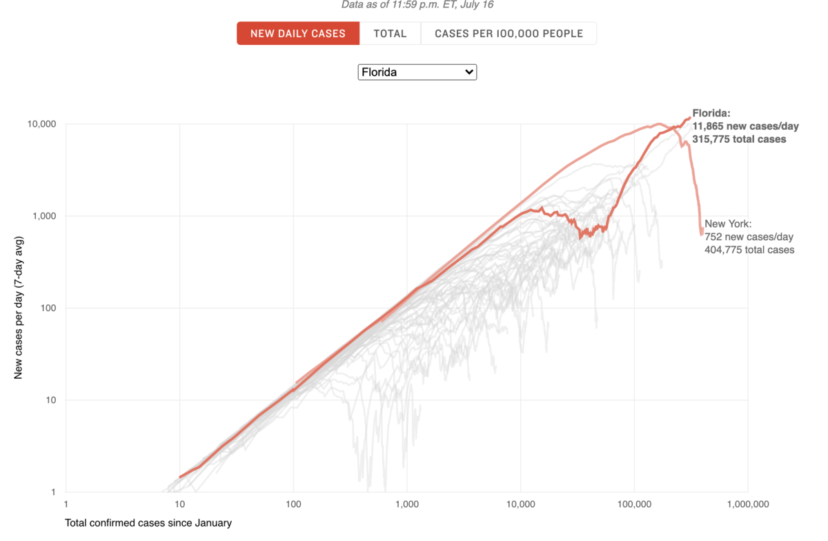 July 17, 20205 yr Based on this Florida seems to have surpassed the peak cases/day of even New York with no signs of stopping. In case anyone is wondering the other 2 straight lines right around there are Texas and California. https://www.npr.org/sections/health-shots/2020/03/16/816707182/map-tracking-the-spread-of-the-coronavirus-in-the-u-s