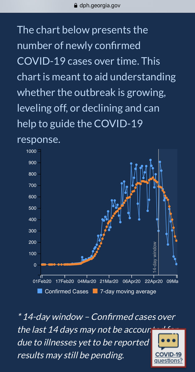 May 10, 20205 yr In what is good news out of Georgia, 14 days after the partial reopening, their downward trend in daily cases continues. I truly hope this is a nationwide trend and can help us reopen. This is data that we can use.