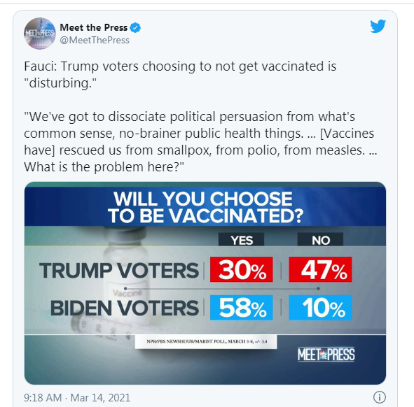 March 15, 20214 yr 5 minutes ago, paco said: Link? I'm pretty sure that was posted early, but he's right. https://www.businessinsider.com/fauci-says-vaccine-hesitancy-among-trump-supporters-is-distrubing-2021-3
