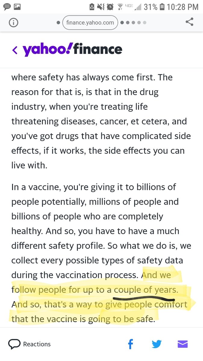 March 16, 20214 yr 1 minute ago, IFB DOG said: Personal. Responsibility. Here's Novavax CEO talking about the importance of safety re: AZN ish show. But but but.... the P1a/b and P2 were okay.... Right, that's called a phase 4 trial. It's standard for any drug or vaccine the FDA approves. It's even more stingent for vaccines. I am required by law to submit every significant adverse event that occurs from a vaccine to the department of HHS. Even ones that have existed for decades. Pass out after the polio vaccine? I'm filling out a report. I don't know what you're trying to prove here.