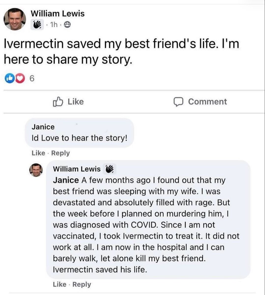 September 10, 20214 yr 3 minutes ago, Procus said: Somebody (WGB) has his brain stuck way up his butt, and otherwise doesn't understand what constitutes "compelling evidence" I know somebody whose aunt's half-sister's cousin lived next to a barber who took ivermectin and died.