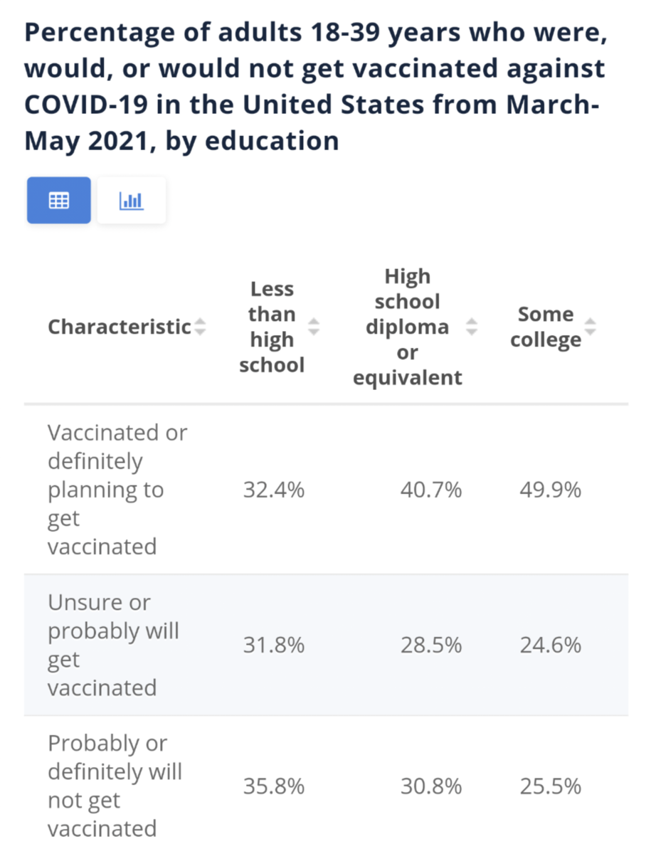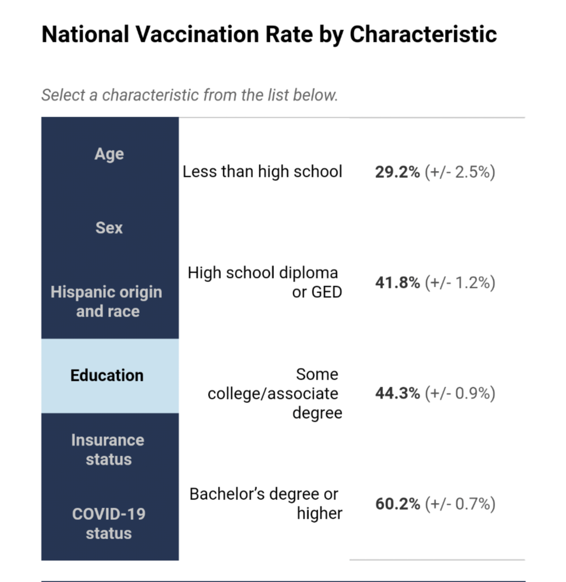 September 14, 20214 yr We still haven't even gotten passed hydroxychloroquine Anyway just because I like making idiots look like idiots, here's the data on education levels and vaccination: https://news.usc.edu/182848/education-covid-19-vaccine-safety-risks-usc-study/ https://www.shadac.org/news/HPSVax-06.21 https://www.statista.com/statistics/1251249/us-covid19-vaccination-and-intent-among-younger-adults-by-education/ https://www.census.gov/library/stories/2021/04/how-do-covid-19-vaccination-and-vaccine-hesitancy-rates-vary-over-time.html There's no media narrative here. Less educated people are less likely to be vaccinated. Probably cause they're stupid.