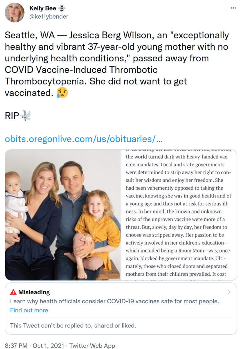 October 3, 20214 yr Notice the disclaimer that Twitter felt obligated to attach to this tweet. Twitter also forbids sharing the tweet on twitter and it may delete the tweet, hence the screenshot. I also gave link is to the actual obit. Good morning everybody, and Go Eagles! https://obits.oregonlive.com/us/obituaries/oregon/name/jessica-wilson-obituary?pid=200278331