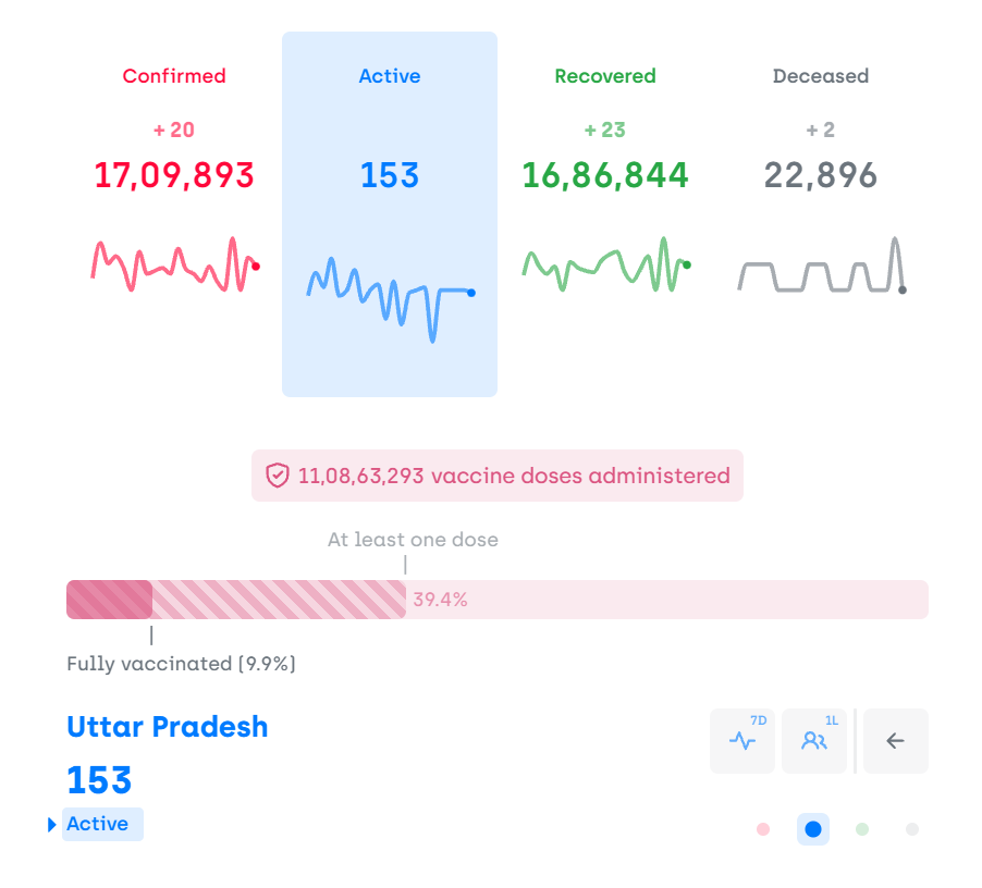 October 5, 20214 yr https://timesofindia.indiatimes.com/city/lucknow/covid-caseload-in-31-up-districts-falls-to-zero/articleshow/86741028.cms https://swarajyamag.com/insta/40-of-up-now-covid-free-no-active-caseload-in-31-districts Nearly 40 per cent of Uttar Pradesh is now Covid-19 free and the state government has declared that out of the total 75 districts, the active caseload in 31 of them has come down to zero. The total active caseload in the entire state was also recorded at a further low of just 159 active cases as of Sunday. About 21 districts of the state are now left with a single active case each. The districts with zero active Covid cases include Amethi, Amroha, Baghpat, Ballia, Balrampur, Etah, Farrukhabad, Fatehpur, Ghazipur, Gonda, Hamirpur, Hapur, Hardoi, Hathras, Jalaun, Kanpur Dehat, Kanpur, Kasganj, Lakhimpur Kheri, Lalitpur, Mahoba, Mainpuri, Mau, Moradabad, Muzaffarnagar, Rampur, Sant Kabir Nagar, Shravasti, Varanasi, Sitapur and Unnao. In the past 24 hours, the state reported 13 fresh Covid cases with seven patients recovering from the disease. The overall positivity rate in Uttar Pradesh now stands at 2.16 per cent, while the recovery rate is at 98.8 per cent. "The fresh cases have declined by more than 38,000 from its peak which was 38,055 on April 24. The state has also been able to restrict the daily Covid case-count below 50 for over 50 days in a row," said an official release. The state is also close to administering 11 crore Covid-19 vaccine doses, leading the country's inoculation drive against the virus.