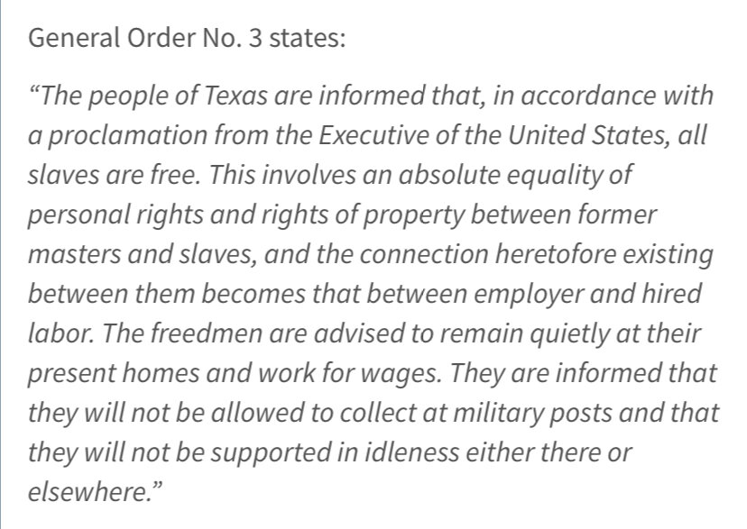 June 18, 20214 yr Author 3 hours ago, lynched1 said: For how long I wonder. I grew up living with black kids and never heard it spoken of until just recently. It’s a Texas holiday. But tbh it’s been recognized more and more. Some other states even started to have their own celebrations. It’s actually a good way to celebrate the end of slavery even though it had already been outlawed in Texas for 2 and a half years (by the Emancipation Proclamation). On June 18, 1865 U.S. troops showed up in Texas to enforce it though. General Granger gave Order Number 3 the next day.