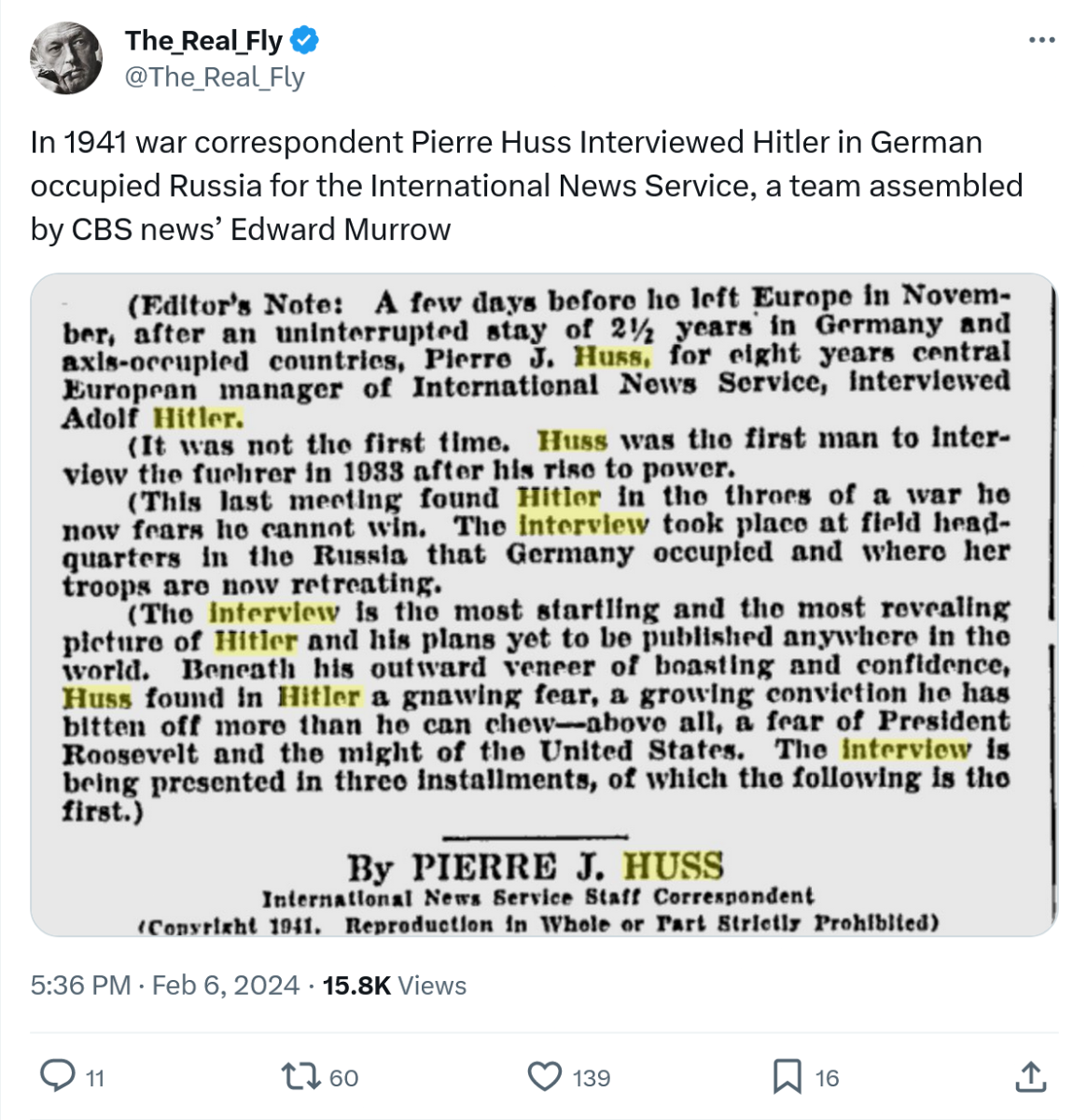 February 8, 20241 yr Just now, Procus said: No - but CBS did at his Russian headquarters You're saying Goebbels never interviewed Hitler? I find that hard to believe.