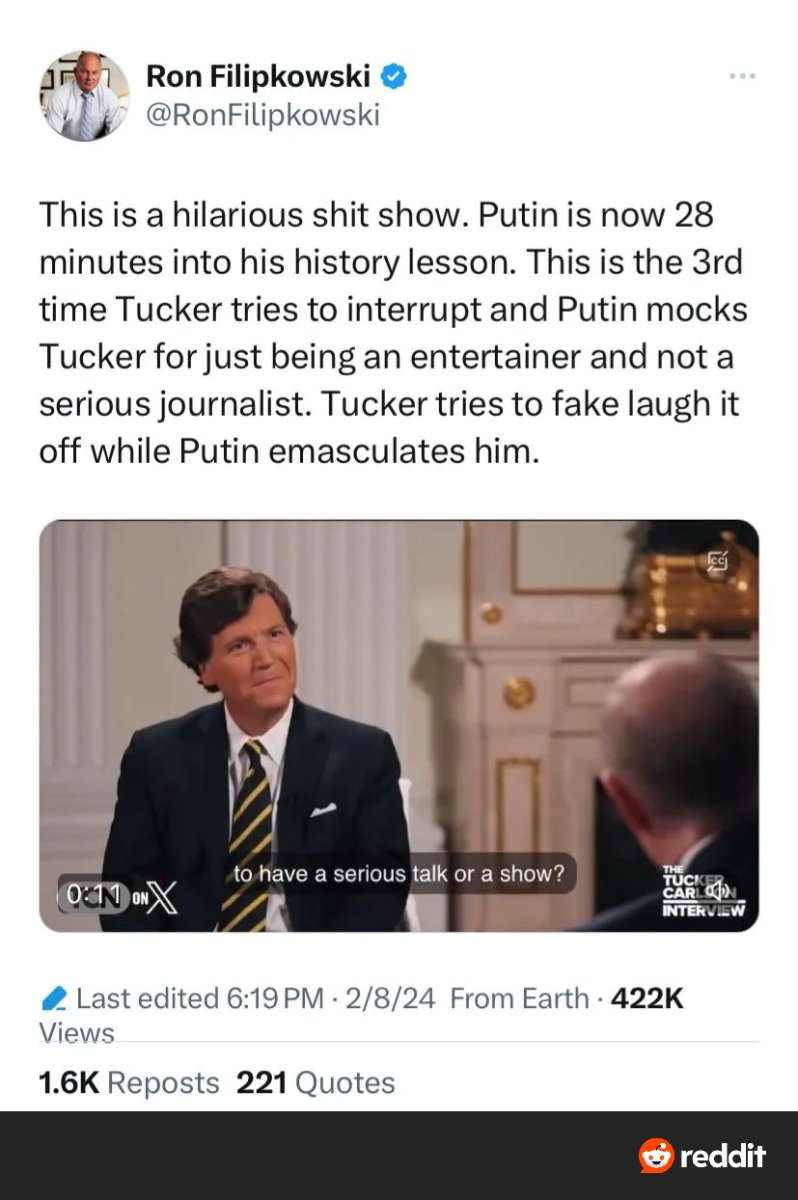 February 9, 20241 yr It sounds like Tucker's interview was a big FAIL. The cliffnotes version I saw says Putin spent 30 minutes recounting a rambling, false history of Russia and Ukraine. Tucker interjecting to move the narrative on but he got rebuffed by Putin. Then Tucker asking strange questions about AI and Elon Musk. Maybe one interesting exchange regarding detained journalist Gershkovich, where Putin responds he will only be released as part of an prisoner exchange. Predictable. Even Russian-compromised Mike Flynn says: https://x.com/GenFlynn/status/1755765794917458103?s=20 Quote I’m certain there will be a lot of Monday morning quarter backing, but the likely rules of engagement for this interview were probably negotiated well ahead of time to get this much time and to have this wide ranging of an interview. Putin will not allow himself to be challenged, and Tucker isn't the one to challenge him. I won't be watching.