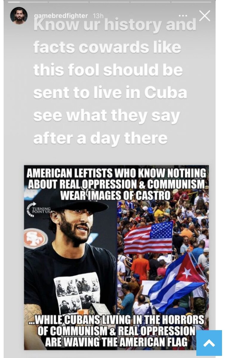 July 20, 20214 yr https://dailysnark.com/2021/07/19/ufc-star-jorge-masvidal-blasts-coward-colin-kaepernick-over-protests-continue-in-cuba/ "UFC’s Jorge Masvidal Blasts ‘Coward’ Colin Kaepernick Over Protests In Cuba Cuban descendant and UFC star Jorge Masvidal took to social media to speak his mind regarding the situation, a rant which included an Instagram story blasting disgraced NFL quarterback Colin Kaepernick. "My father escaped Cuba when he was 14 years old,” Masvidal began. "And I’ve only heard the horror stories since I could process thoughts of how s— this communist regime, killing machine is. So I just want to shed some light on Cuba — big SOS signal for them.” "This oppression has been going on for 61 years,” he continued. "It’s not just because of the pandemic, or it’s not just because they ran out of medicine, because they’ve been out of medicine, they’ve been out of resources and food.” On his Instagram story, he took aim at a former NFL star QB. The UFC star posted pictures of Colin Kaepernick rocking a shirt with Castro on it a few years ago and sent him a stern message. The post read: "Know ur history and facts..cowards like this fool should be sent to live in Cuba…see what they say after a day there.”"