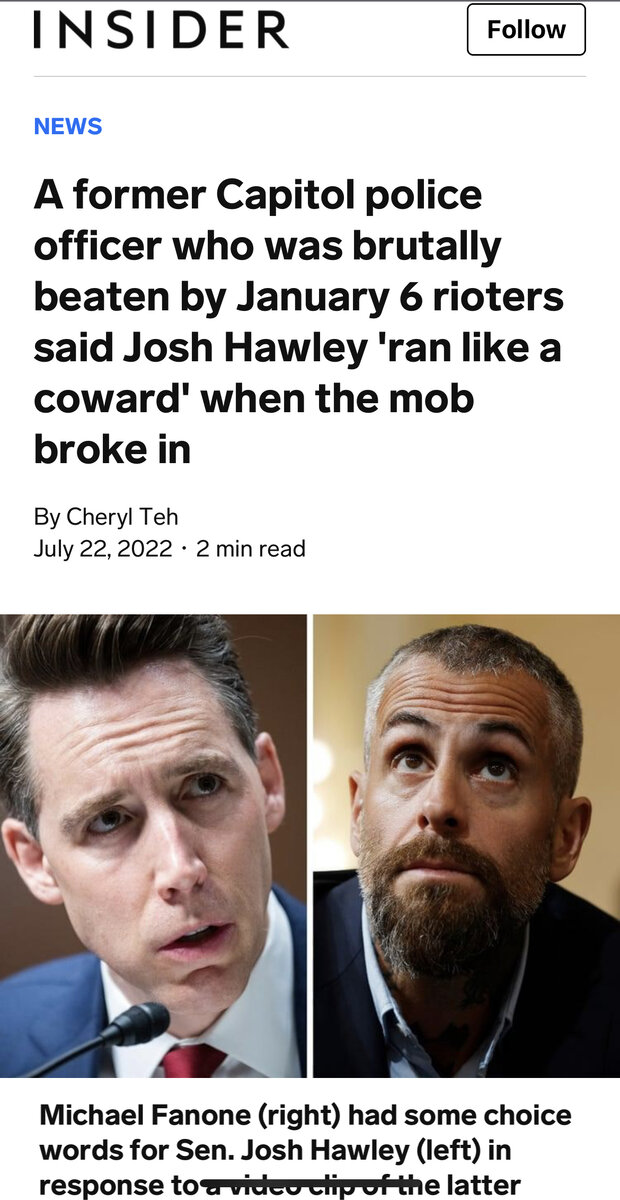 July 22, 20223 yr 1 hour ago, barho said: "Well, to be completely honest, to give you the first thoughts that popped into my mind — Josh Hawley is a b!tch. And he ran like a b!tch," Fanone said when asked about the Hawley clip. Fanone told Politico that there was an "eruption" of laughter after the video clip of Hawley fleeing was played. did he ever work for the uvalde police dept ? too soon ?