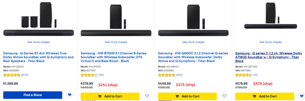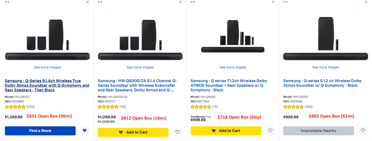 September 1, 20241 yr Ended up getting really lucky today... Agent-length story to follow. I am replacing my 75" QN90A (2021) with an 85" QN90C (2023) this coming Wednesday, and decided that I want something other than my modest Q60T Soundbar/Subwoofer for audio. It's listed as a 5.1 channel (8 speakers),and has the early version of software that pairs your QLED televisions built-in speakers with the sound bar to create a fuller and more immersive sound field. Even so, I find myself needing the volume at ~40 to properly hear certain things I watch, with others have audible vocals at 25. Didn't want to spend $400-600 just to get a 3-4 year newer version of the same thing, so found myself looking at various 5.1 (with expandable Rear Satellites for ~$250), 7.1, and even 9.1 systems. Heck, even the $579 option in the bottom right image below is listing itself as a 3.1.2 with 9 speakers... so that might actually perform better than my current 5.1 w/ 8 speakers for all I know. Finally I decided on the first one pictured below -- and I've listed all the Open Box prices for each product, using their "Excellent Condition" pricing, which BB defines as: Works and looks like new. Restored to factory settings. Includes all original parts, packaging and accessories (or suitable replacement). They had a "Good Condition" at an outlet store about 15mi away, which opened 1hr earlier, so I decided to go there first and check things out as opposed to driving 90 mins to the store 100mi away. The Good Condition is defined as: Works like new. Restored to factory settings. May have minor scratches or dents. May be missing non-essential parts, accessories or original packaging. I get to the BB Outlet, and while many TVs, monitors, and smaller sound bars are nicely packaged, this 9.1.4 is all sitting loose together on a shelf along with shelves of other bundled systems. No packaging, definitely ample scuffs and visual wear on the subwoofer and rear speakers... my guess is this was a store-demo/display for lord knows how long, and the price is only a few bucks cheaper at $655. Decide this isn't what I want, so I kill time waiting for the 90min away store to open and call them, transfer to Home Theater, ask the guy if he's in the Rochester store (he says yes), and mention that I am at the Outlet an hour and a half away in Minneapolis where I live, and want to verify that SKU 6535890 in their store is all together in its original packaging as they are listed as having 1 Excellent Condition unit as part of their inventory on the website/App. Puts me on hold maybe 5 mins, comes back apologizing for the delay, and confirms that "yep, everything is here in the box" and confirms with me that it has all the packaging. Jump in the car, make a purchase from my phone for Store Pickup, knowing the 90min drive will be more than enough for their 1hr pick up. Arrive and go to the counter, scans the code on my phone (I already got notification my item is ready), and the guy goes "one of your items is ready for pick up, but the second item isn't yet." Immediately I'm like "what? what second item? I only have one purchase." He doesn't tell me or seem to know what it is, just that its telling him 1 of 2 is available. As he goes to grab the 1, I am checking my BB app and my email order confirmation to see if I had something else randomly in my cart, but my checkout was $750ish which is right around what a $691 + tax purchase should ring up as. While I'm distracted with this, I see he's setting on an adjacent counter all these individual components. The most scuffed up subwoofer I've ever seen, satellites marginally better looking that the ones at the Outlet store, and a sound bar blanketed in a ton of bubble wrap. I'm immediately like "whoa whoa whoa, did y'all grab the wrong one? Mine was the Open Box Excellent Condition." This is what was tagged as that and the only open box they had. I mention calling someone just over an hour ago, and they tell me that it goes to a dispatch, not the store, and that those people are told to say that "yes, they are at the store" that you are calling. So that guy presumably just saw the Excellent Condition listed online as how the local store had filed their inventory and "confirmed" with me that the set was packaged/like brand new. Associate can't help which I understand, so they radio Manager, who we explain things to. Me impressing on my call to the store, confirmation that they were "at the store", and that the item met its Excellent Condition status. Manager apologies, says they might be able to shave off some price (he guessed $30), and I mention that maybe $100 could do it given the visual state of the parts... but that I could stand off to the side to wait (other people arrived behind me) while they check into it. While off about 15 feet, I'm looking at my phone and see that I can get one shipped to my house -- figure if they can knock $100 off maybe I take that one, order one to delivery Thursday (1 day after my new TV arrives and gets installed...) -- and if that one also shows up janky or looking like its been a store display unit for the past year, return both or if the online-shipped one is perfect, keep that and swap the soundbar out on the TV mount that installers will be doing on Wednesday. Before I can commit to adding to cart and buying the shippable Open Box Excellent. Manager calls me back, says they are going to process my transaction and "pick up" status of the open box item, and points over by the front door to a Brand New sealed in the box HW-930C and says they are just going to process my $691 (plus tax) transaction and let me take a new one they have in stock. So my 3 hour round trip ended up landing me a brand new system for what effectively ended up being 50% off! Once again Best Buy comes through for me!