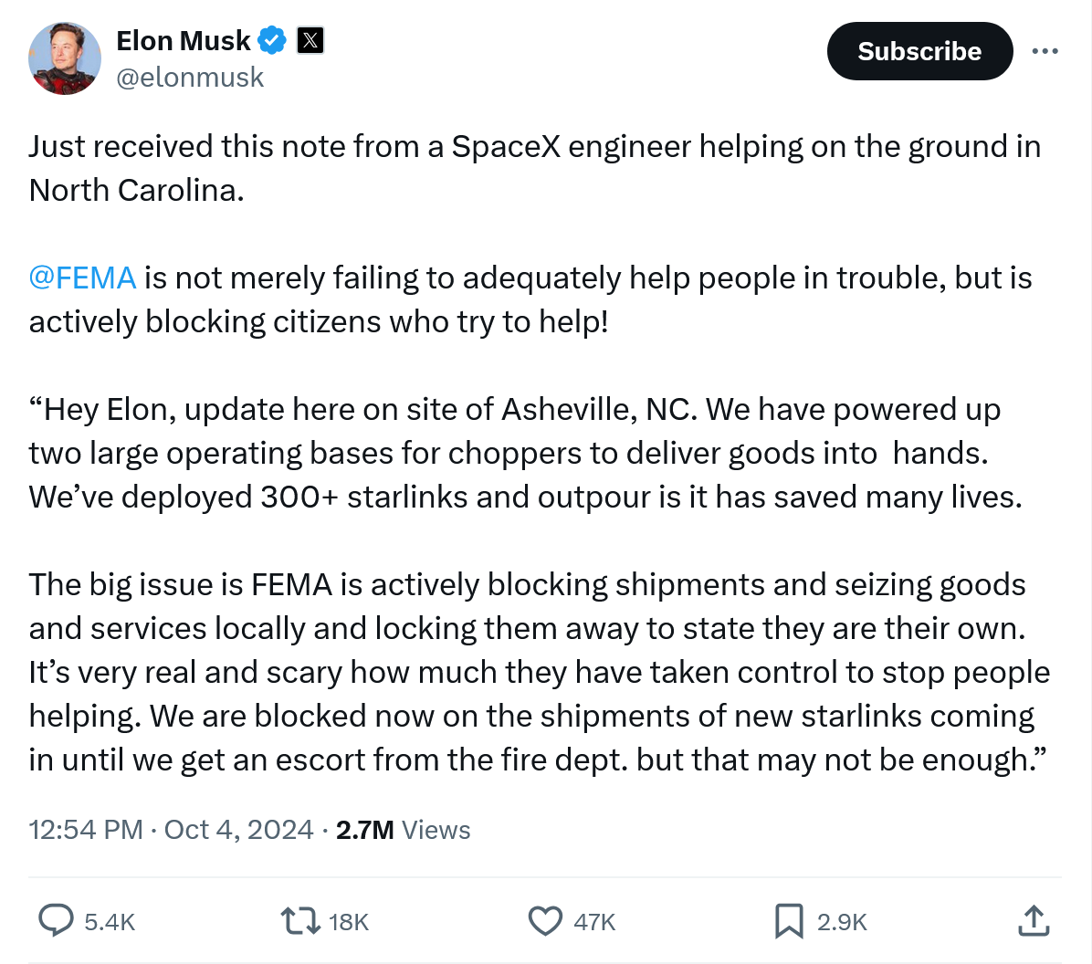 October 4, 20241 yr I guarantee you that if Musk doesn't get a parade down 5th Avenue for his Starlink contribution we're going to get "FEMA runs a pedo ring" tweets within two weeks.