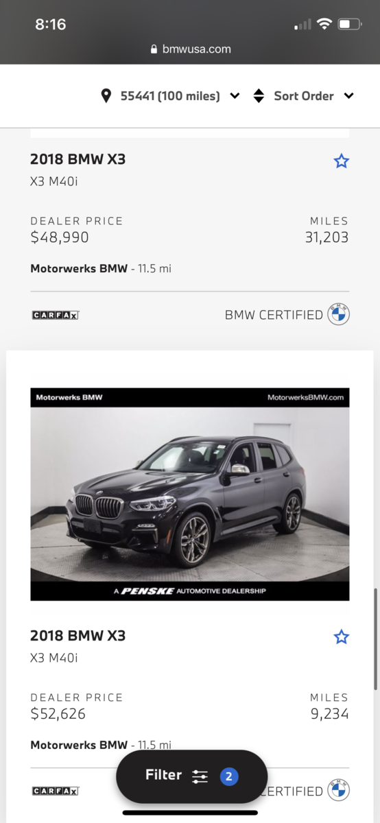 Speaking of buy-backs, here are two (that fit on the same screen) at the dealership 5 miles from where I live. My 2018s options fall somewhere in the middle of these two, and my mileage is 16,394 according to my apps status as of 2 hours ago when I got home and parked. So somewhere in the $50-51k range is what they would look to sell mine for and I think after my auto-pay on Friday my loan balance will be down to ~$16,500