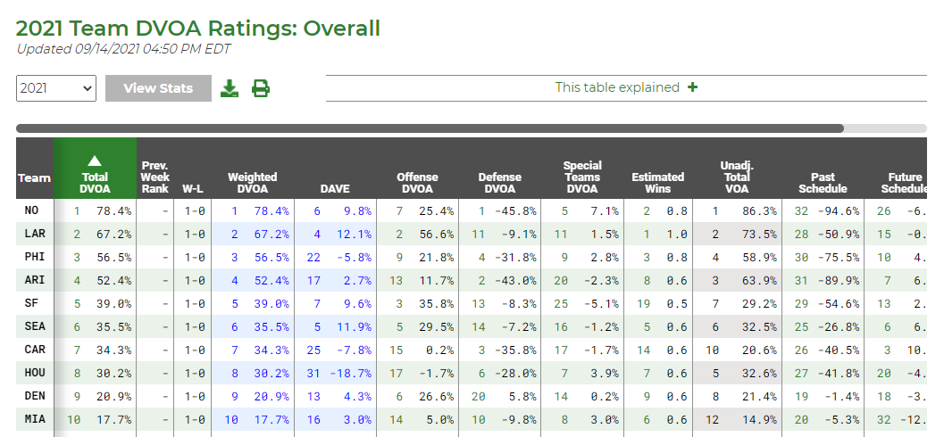 September 14, 20214 yr Author So we are #3 overall in DVOA after one week. Top-10 in all three phases. (Adjustment for opponent strength won't be added until week 4.)