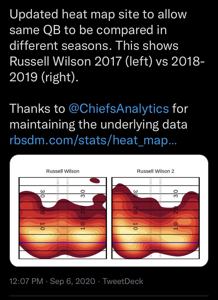 September 23, 20214 yr Russell Wilson heat map of frequency of passes by location. He doesn’t throw as often over the middle, but he doesn’t exactly avoid it, at least prior to 2020.