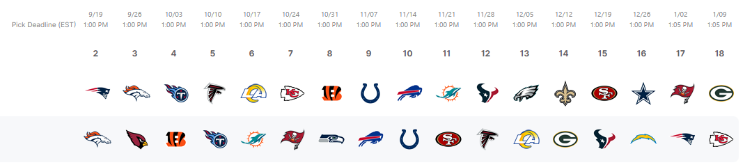 September 17, 20214 yr Author We are doing one at work through some new-to-me website. Lets me pick ahead and vanishes out a team after I've picked them. These will change over the season I'm sure but I tried to do a rough map out of the year using two different approaches where I don't repeat any given week