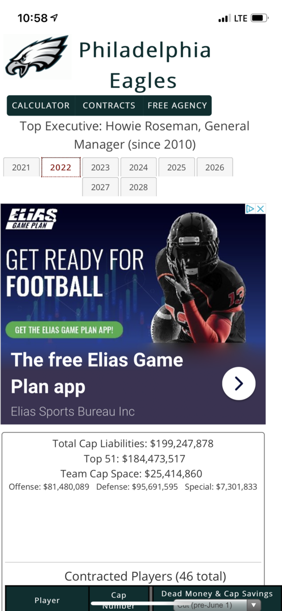 September 19, 20214 yr 1 minute ago, MillerTime said: 16M this year 25M next year with a possible roll over from this year. 52M in 2023 This is with Sweat and Mailata wrapped up. There is money to sign next years rookies and bring in some Free Agents. Where are you getting 25 million next year ?? They have 8.9 next year.