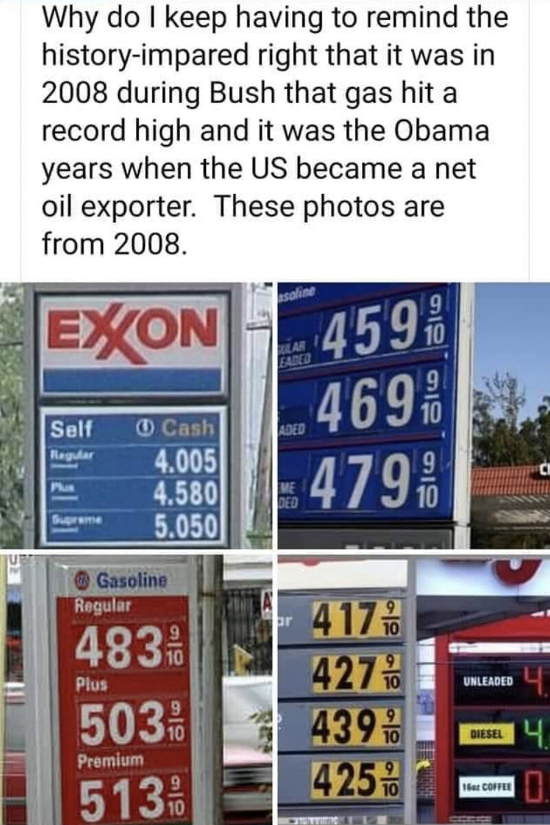 November 15, 20213 yr 1 hour ago, Toastrel said: Why do you people have such a tough time understanding that oil and gas are a global commodity? https://www.globalpetrolprices.com/gasoline_prices/ I get it. Neither Bush nor Biden are/were spinning the price roladex at the pump. Had a conversation over the weekend with some trumpers who were crying about gas prices and Biden ruining the country. Going into a discussion about global price commodities with them wasn’t going to accomplish anything, so I reminded them of prices under Bush. Not surprisingly… that conversation didn’t accomplish anything either… but here’s a meme.