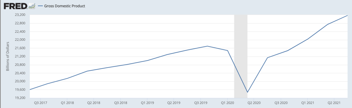November 15, 20213 yr 55 minutes ago, lynched1 said: Rhetorical question How long can the press holdout before mainstream reporting of the Carter era "misery index" becomes a drum beat? sorry to disappoint you, but we're nowhere close. you need a stagnant economy - which I guess you're rooting for - to get to Carter territory. we're not in a recession. unemployment is not very high right now, and it's trending down each month. wage growth is up significantly over pre-pandemic values. GDP is also returning to where it would have expected to be: the only major economic issue right now relates to supply chain issues. consumers have money and are demanding goods and services at historic highs, the issue is getting those goods and services to the consumers. this is almost entirely pandemic related, and global in nature.