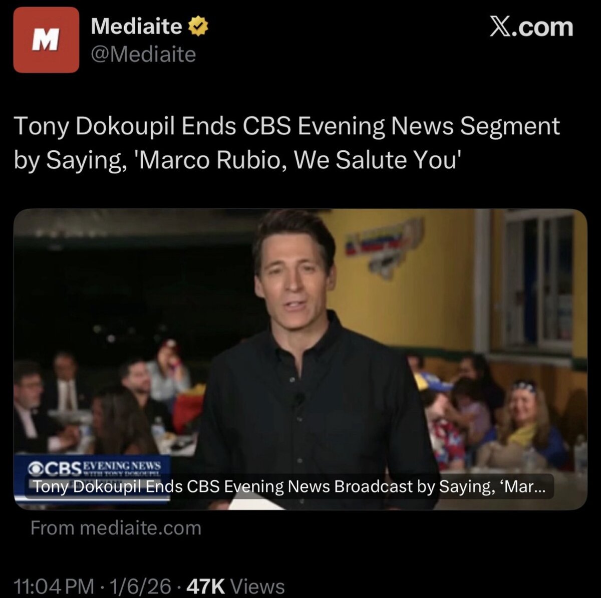 January 7Jan 7 Thank you, CBS! This is finally the unbiased, straight down the middle MSM reporting we’ve been asking for for all these years. A lot of people don’t know this but Edward R Murrow used to sign off by saluting the government