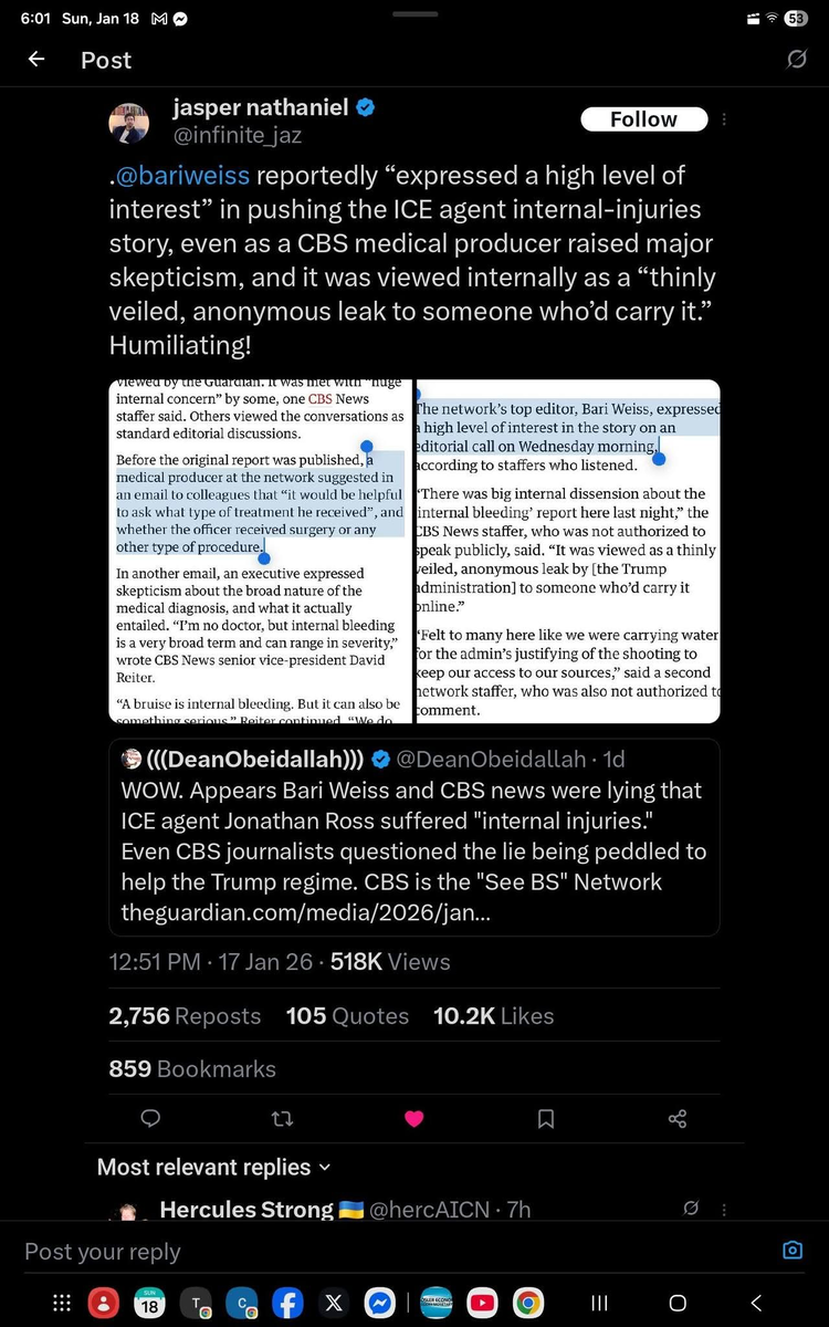 January 18Jan 18 Trump admin floated a fake story hoping an unscrupulous online blogger would spread it. Bari Weiss at CBS picked it up and ran it.