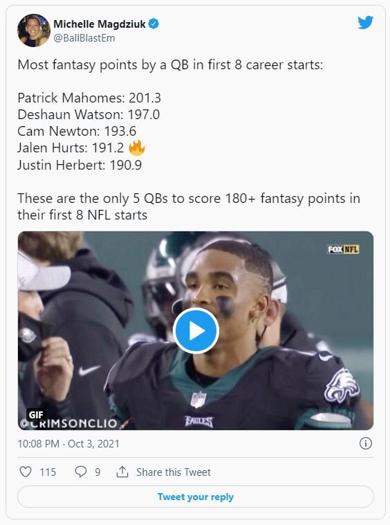 Posted October 8, 20214 yr Jalen Hurts Shares What Patrick Mahomes Told Him By Mike Greger Updated Oct 7, 2021 at 6:34pm Getty: Eagles QB Jalen Hurts has been electric in four starts, including a career-high day against Kansas City. There was a brief moment last week when Patrick Mahomes and Jalen Hurts shared an embrace at midfield. Players usually keep those conversations close to the vest, but the Philadelphia Eagles quarterback shared a portion of what the NFL MVP told him. Hurts had just enjoyed arguably his best on-field performance, or at least the greatest one of his professional career. However, it came in a brutal 42-30 loss to the Kansas City Chiefs. After the game, Mahomes whispered some encouragement into Hurts’ eager-to-listen ears. "Keep on playing the way you’re playing, you know, keep ballin’, it’s going to come, it’s coming,'” Hurts told reporters when asked what Mahomes said to him. "But, obviously, training with him in the offseason and working with him and being able to build a relationship with him … I have a lot of respect for him, obviously, and I’ll see him again one day.” If that last part sounds like a threat, maybe it was. Hurts is a prideful player and he keeps reiterating how close the Eagles are to putting it all together. They are inches away – the distance between Hurts’ thumbnail and index finger – from getting back in the win column. It’s coming. "This close, we’re coming,” Hurts said. "It’s going to click and when it does, it’s going to be real pretty.” Making Accurate Throws, Creating Plays Rattling off the numbers from Week 4 is a torturous exercise. Why? Because, on paper, it looks like the Eagles won the game. Hurts threw for a career-high 387 yards and 32 completions while combining for 434 yards of total offense. More importantly, he didn’t turn the ball over and threw for the most passing yards since Nick Foles chucked it for 406 yards without an interception in 2013 (via Eagles stat guru John Gonoude). Head coach Nick Sirianni called it the top quarterback performance he’s ever seen. He’s been impressed with Hurts through the first four weeks, but not surprised. Remember, this is the guy he made compete for the job at training camp. "What I love about how Jalen is playing is I think he’s playing the position of quarterback well, right? He’s making the right decisions with the football,” Sirianni told reporters. "He’s making accurate throws. When he needs to create, he’s creating. And he’s getting to where we want him to play.” The next part of Hurts’ development centers on consistency. Stacking days as the cool kids say. "I think he’s playing really good football and he’s turned himself into a good quarterback,” Sirianni said. "And so, we’re looking to just – but part of that is consistency. And we’ve just got to do that each and every week, so looking forward to the challenge we have this week with Jalen and with the Panthers.” Le’Raven Clark Restored to Practice Squad The Eagles made a minor roster move earlier this week when they restored Le’Raven Clark to the practice squad. The veteran swing tackle played in 47 regular-season games (15 starts) during a five-years run with the Indianapolis Colts. To make room on the roster, the team released linebacker Christian Elliss from the practice squad. https://heavy.com/sports/philadelphia-eagles/jalen-hurts-patrick-mahomes/