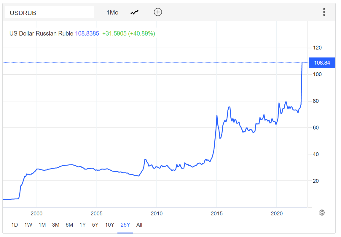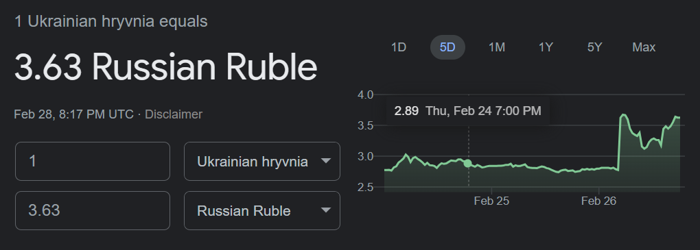 February 28, 20223 yr 1 minute ago, JohnSnowsHair said: thing is, in the 21st century Russia cannot unilaterally claim "Ukraine's borders have changed". that's the issue. so no, they haven't. Russia has been illegally occupying Ukraine for 8 years, and providing significant support to rebels in Donbas. Russia is losing. And will continue to lose. They can't even open their stock market for fear of how bad it is, they cannot raise funds from even China, their credit rating such as it was is completely shot, Russian citizens aren't even sure the Rubles they have in the bank are accessible anymore - Rubles which are worth a lot less today than they were a week ago, and Ukraine STILL won't back down. No amount of propaganda and newspeak is going to change that comrade. yeah it's been there a bit now. this is from last night. Declaring one's independence does not violate international law. Kosovo did it. Russia is taking steps to defend the Ruble. Increasing the interest rate to 20% will help. When you have such little debt as Russia, high interest rates are manageable. Last I checked, the Ruble was around 98/USD. For comparison, it got to 115 the last time sanctions were imposed. China may not need to buy Rubles right now. However, if Russia really needed that kind of support, it's not clear that China would say no then.