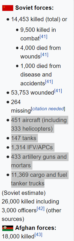 March 2, 20223 yr for the hell of it, I tried to take a quick look at contrasting Russian losses in Afghanistan vs Ukraine. They're kind of surprising. Here's my source for Ukraine: https://www.statista.com/statistics/1293424/russia-s-loss-in-the-war-in-ukraine-by-type/ And I used Wikipedia for Afghanistan: https://en.wikipedia.org/wiki/Soviet–Afghan_War Numbers are of course a bit arguable. but if they're even remotely true, the losses Russia sustained in a week really are staggering. Ukraine: Afghanistan: Afghan losses were certainly more. But not nearly as much more as you'd think. The cost of Afghanistan in rubles was much higher of course because it was a 10 year war, and that's where it really became a consistent drain on the ability to pay for the war. But still ...