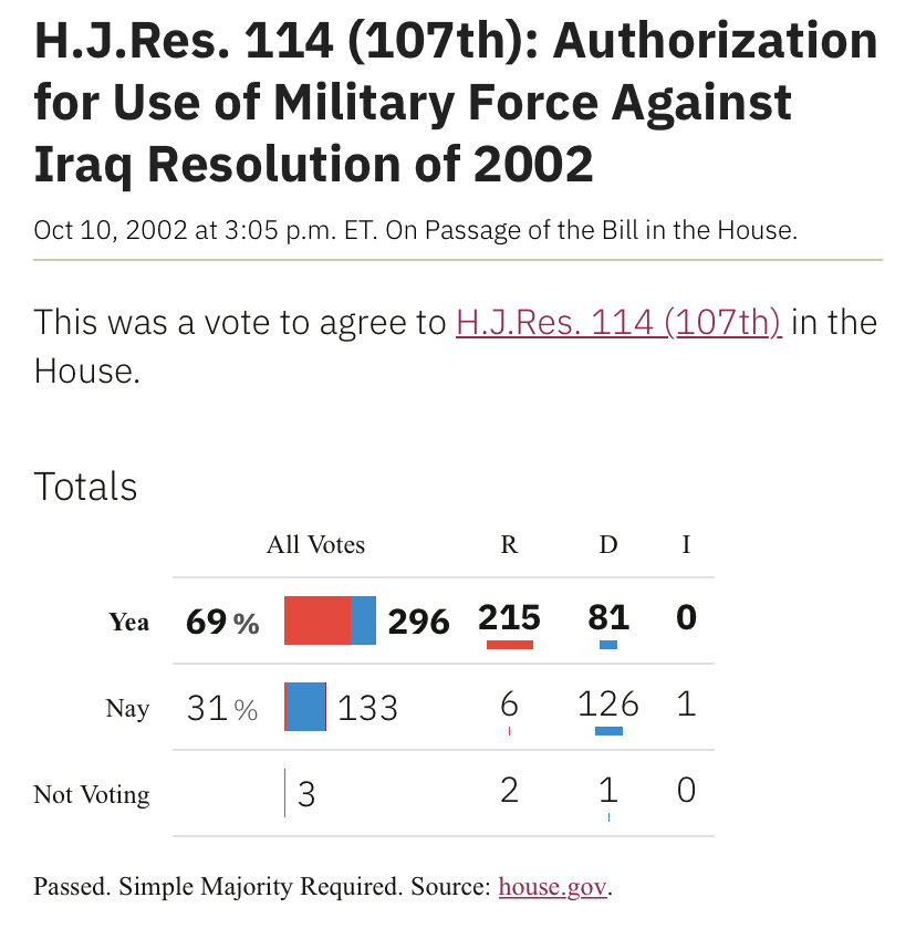 February 8, 20223 yr Both House and Senate voted for Iraq resolution giving Bush the go ahead. Most Democrats voted no, but GOP had the votes. Party line voting to take nation to war. So sad. https://www.cbsnews.com/news/congress-says-yes-to-iraq-resolution/