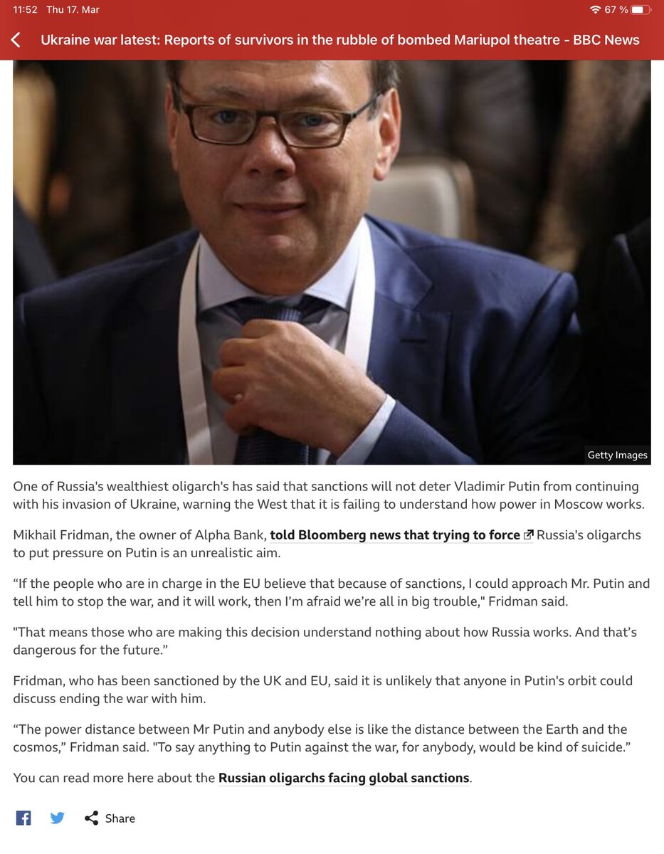 March 17, 20223 yr 21 minutes ago, JohnSnowsHair said: Oh well. They need to suffer anyway as they have stolen money from their own people. Cry me a freaking river, Mikhail.