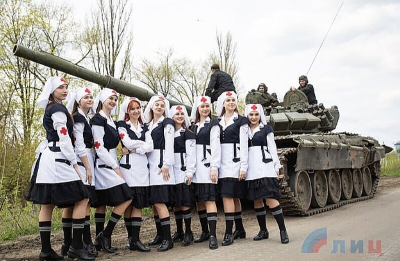 April 29, 20223 yr Russian Angels "Sisters of Victory” https://www.dailymail.co.uk/news/article-10765463/Sisters-Victory-don-nurses-outfits-Z-emblem-pose-troops-Ukraine.html