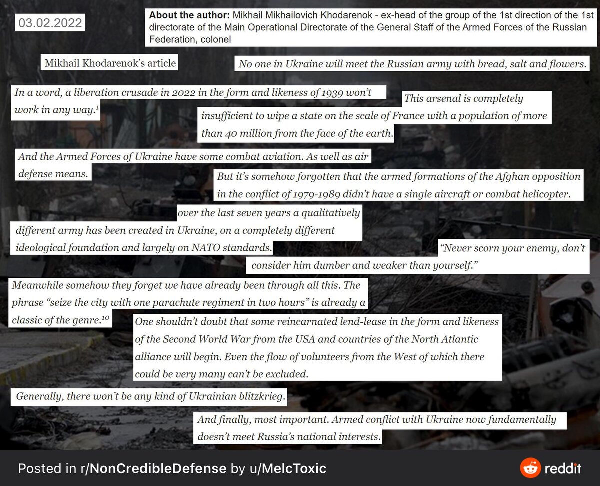 May 9, 20223 yr 2 hours ago, Abracadabra said: If you looked at a topographical map, then you know the town is on a hill of over 1k ft. That's a good vantage point even if there are other hills in the area. This town has a railway exchange the Ukrainians used for shipments of weapons. Gone. The Ukrainians spent eight years fortifying, mining and barricading the entire area. The place was a fortress. No more. NATO trained the Ukrainians for eight years in NATO tactics. They built extensive fortifications and dug in deep. Russia is slowing wearing them down taking minimal casualties while imposing horrific, unsustainable casualties for Ukraine. The second largest NATO army is being pulverized. Funny I didn’t know a 250m tall hill is over 1k feet. Learn something new every day. Popasna must have a commanding viewpoint to the east of Pervomais’k, the town the Russians attacked from, which sits on top of much smaller hill that is… *checks notes* …200m tall. Also Popasna doesn’t have a railway exchange. It’s a spur line that ends the next town over, bud. Hence why it’s of no tactical value to the Russians since it doesn’t allow them to use it to project any logistics capability deeper into Ukraine. 1 hour ago, Abracadabra said: Me trying to find the "incursion” on that map of the front: That’s a nice Bargain Bin Battle of the Bulge the Russians have going there.