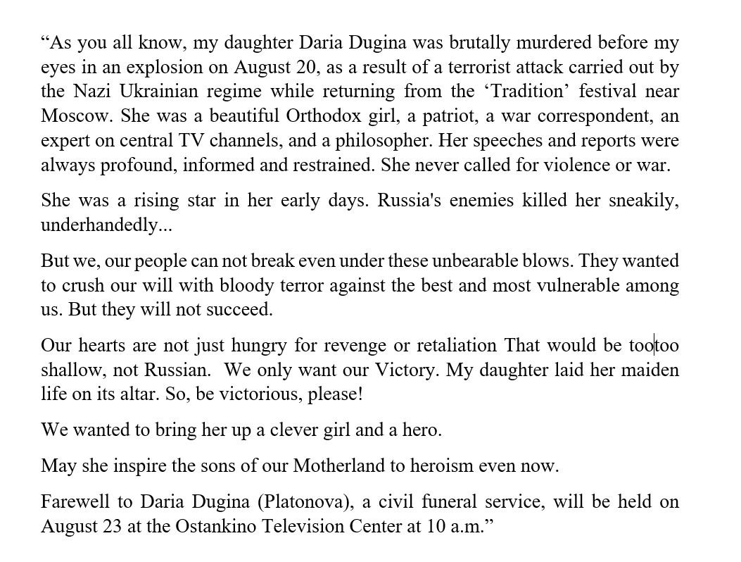 August 22, 20223 yr She was killed by an internal faction. Either an independent group in Russia or the FSB, who often clumsily engineer killings by "radical groups" that they manufacture.
